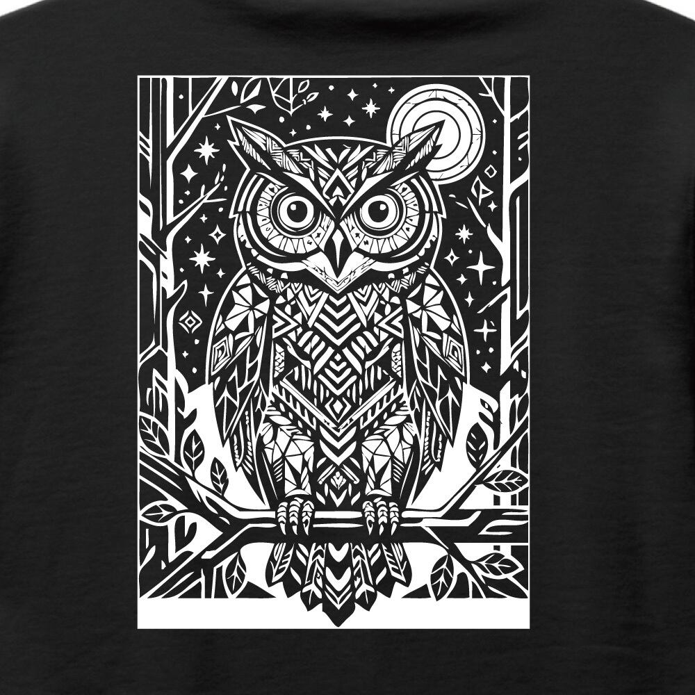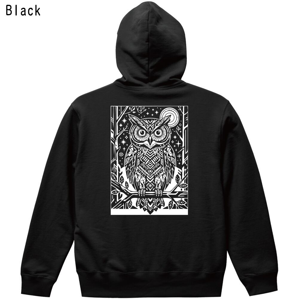 幸運を呼ぶフクロウ バックプリント パーカー 幾何学模様 ホワイトプリント|ブラック 黒 プルオーバー フーディ ユニセックス 北欧風 ギフト