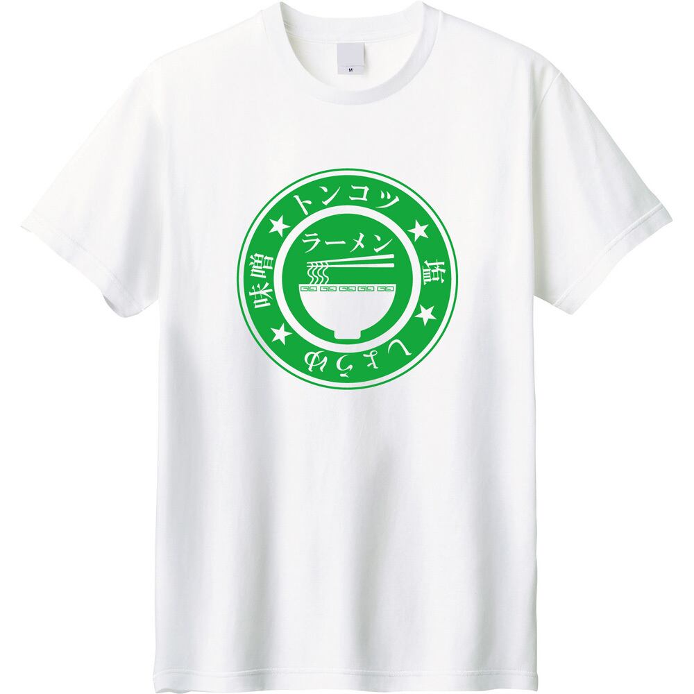 このTシャツのデザインは、ユニークなラーメンロゴプリントが魅力。