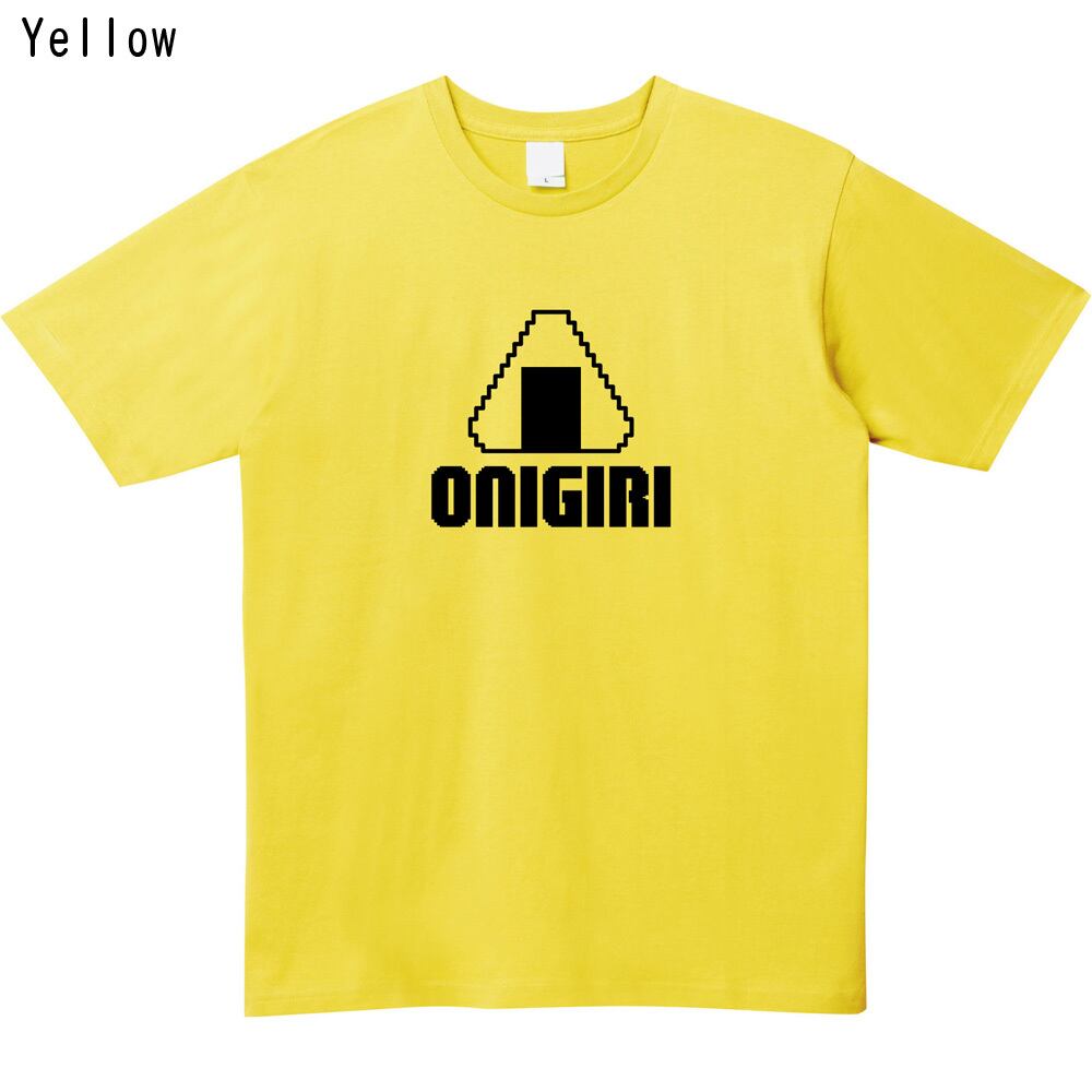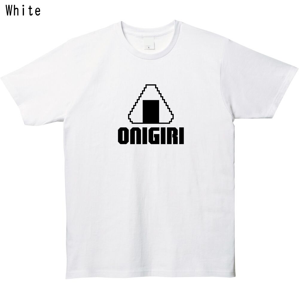 このTシャツのデザインは、ドット絵で表現された三角おにぎりをモチーフにしたかわいらしいロゴプリントが魅力です。