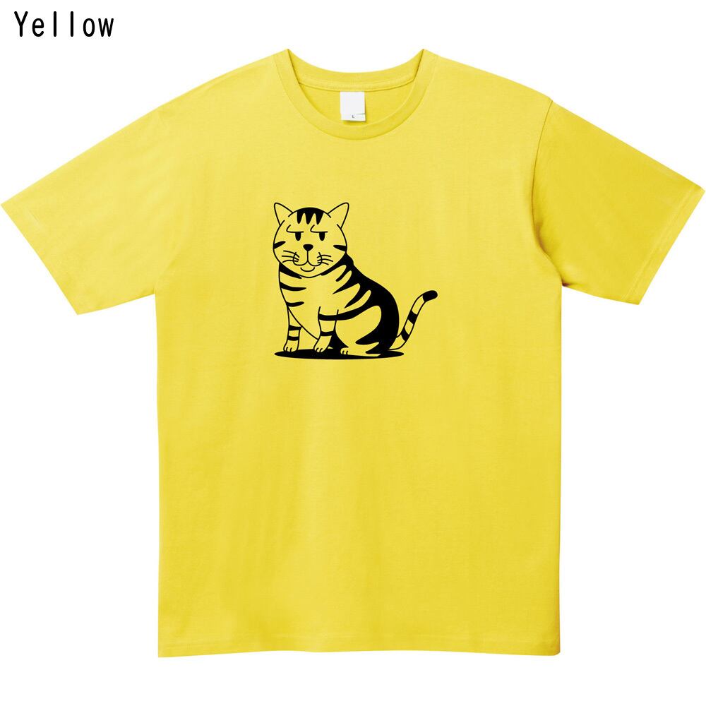 冷めた目でじっとこちらを見つめる猫のプリントが印象的なこのTシャツは、猫好きなあなたにぴったりのアイテムです。